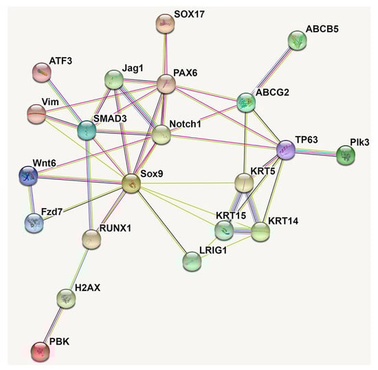 Protein-protein interaction networks of 21 LSC marker genes by STRING analysis. By direct/indirect interactions with other LSC molecular markers, transcription factor SOX9, SMAD3 and PAX6 work together with other stem cell proteins Notch1 and ABCG2, may act as master regulators mediating the proliferation and differentiation of LSC, which is crucial for eye development and corneal surface regeneration.