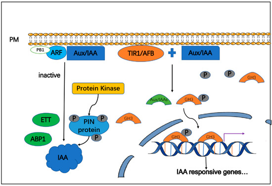 The IAA signal transduction pathway has been described in detail. Canonical auxin signal transduction mainly depends on the following three protein families: the F-box transport inhibitor response 1/auxin signaling F-box protein (TIR1/AFB) auxin co-receptors; the auxin/indole-3-acetic acid (Aux/IAA) transcriptional repressors; and the auxin response factor (ARF) transcription factors [24,25]. The accumulation of IAA leads to faster hydrolysis of the Aux/IAA protein and alleviates the inhibition of auxin response genes by allowing the formation of ARF dimers. Although this proposed model cannot explain the function of the ARF subtype, it is considered as an inhibitor. The TIR1/ABF protein binds to the Aux/IAA transcription inhibitor and participates in its polyubiquitination and subsequent proteasome-based degradation. This pathway rapidly induces auxin response genes—including Aux/IAAs and the auxin-responsive Gretchen Hagen3 (GH3) family of auxin homeostasis regulators—and subsequently triggers a negative feedback loop. However, when the IAA level is low, the Aux/IAA transcription inhibitors interact with ARFs and inhibit their activity [26].