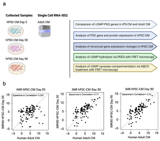 (a) Schematic of the executed experiments for the study. (b) Spearman’s correlation in fold changes of cGMP-PKG pathway gene expression in IMR-hPSC-CMs cultured for 5, 30, and 90 days as compared to adult cardiomyocytes.