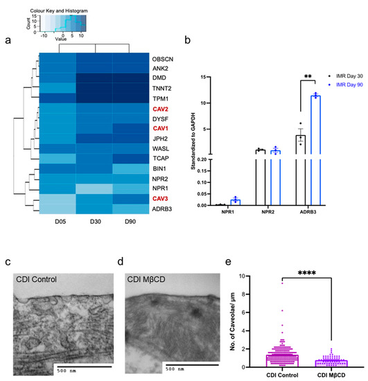 Expression of structural components in hPSC-CMs aged day 5, 30, and 90. (a) Heatmap of structural gene expression in IMR-hPSC-CMs aged day 5, 30, and 90. (b) Gene expression of Natriuretic peptide receptors (NPR) 1/2 and ADBR3 in IMR-hPSC-CMs aged day 30 and 90. Representative transmission electron microscopy (TEM) images of control (c) and methyl-β-cyclodextrin (MβCD) (d) treated CDI-hPSC-CMs. (e) Quantitation of caveolae per micrometre in CDI-hPSC-CMs. ** p < 0.01; **** p < 0.0001.