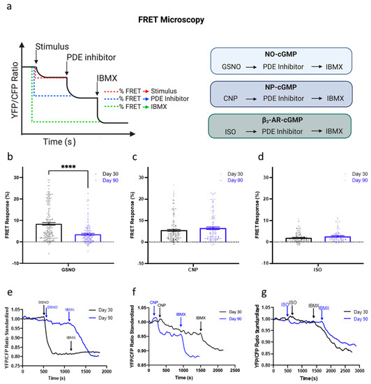 Knowing that prolonged culture of hPSC-CMs may contribute to changes in cGMP signaling, we next undertook FRET microscopy to examine the physiological changes in cGMP compartmentation (Figure 4a). The production of cGMP upon the stimulation of the three different pathways, NO-, NRP2-, and β3-AR-NOS, was analyzed in IMR-hPSC-CMs (Figure 4b–g). As cells aged in culture from day 30 to day 90, there was a significant decrease in the amount of cGMP produced upon the stimulation of the NO-cGMP pathway with GSNO but no changes were observed when the NRP2- and β3-AR-NOS pathways were stimulated (Figure 4b–d). Furthermore, the amount of cGMP produced upon the stimulation of the β3-AR pathway was remarkably lower than the amount produced upon the activation of the other two pathways (Figure 4d). Together this data shows that upon their stimulation, these three different pathways produce different levels of cGMP, which may, in part, be regulated via changing of PDE activity.