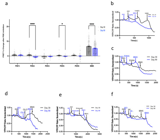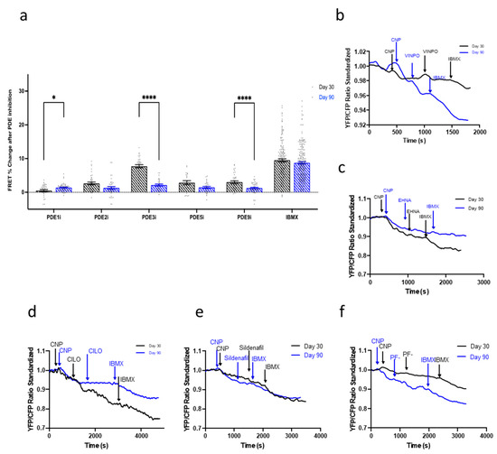 (a) The regulation of the β3-adrenoreceptor (AR)-cGMP pathway by PDEs throughout the aging of hiPSC-CMs in culture from day 30 to day 90. Model traces of cGMP production after the inhibition of β1- and β2-AR and situation of β3 via isoproterenol (ISO) and subsequent (b) PDE1 inhibition via vinpocetine (VIMPO), (c) PDE2 inhibition via EHNA, (d) PDE3 inhibition via Cilostamine (CILO), (e) PDE5 inhibition via Sildenafil, and (f) PDE9 inhibition via PF-04447943 (PF-), and saturation via 3-isobutyl-1-methylxanthine (IBMX). All data is composed of three independent experimental batches. * p < 0.1; **** p < 0.0001.