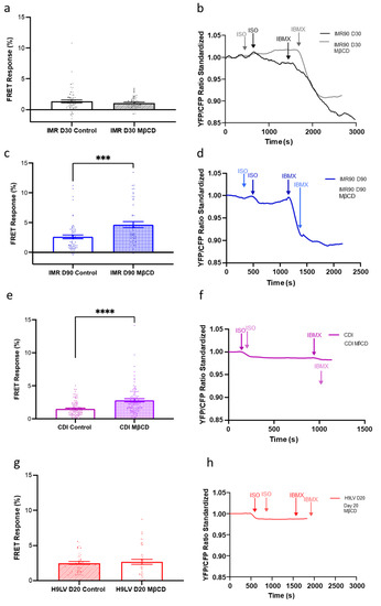 The effect of methyl-β-cyclodextrin (MβCD) treatment on the β3-adrenoreceptor (AR)-cGMP pathway in different lines of hPSC-CMs. Bar chart and model trace illustrating the effect of MβCD treatment on the cGMP production upon β3 -AR stimulation with isoproterenol (ISO) in (a,b) IMR-hPSC-CMs (IMR) Day 30, (c,d) IMR-hPSC-CMs (IMR) Day 90, (e,f) CDI-hPSC-CMs (CDI) grown in our lab for 40 days, (g,h) H9-hPSC-CMs (H9LV) Day 20. All data is composed of three independent experimental batches. *** p < 0.001; **** p < 0.0001.