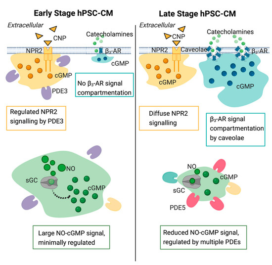 Numerous studies have highlighted the therapeutic benefit of harnessing cGMP for the treatment against heart failure [19,20] and fibrotic pathologies [21,24]. Thus, it is crucial to understand how the compartmentation and signal specificity of the cGMP pathway develops. Using hPSC-CM as a developmental cell model, we have explored how the three major signaling pathways of cGMP, namely, NO-cGMP, NP-cGMP, and β3-AR-cGMP, mature over time in culture.