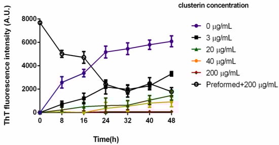 - Yerbury, J.J.; Poon, S.; Meehan, S.; Thompson, B.; Kumita, J.R.; Dobson, C.M.; Wilson, M.R. The extracellular chaperone clusterin influences amyloid formation and toxicity by interacting with prefibrillar structures. FASEB J. 2007, 21, 2312–2322. [Google Scholar] [CrossRef] [PubMed]