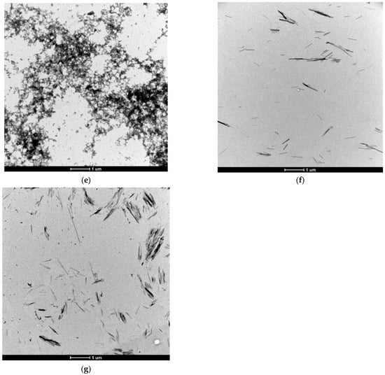 TEM micrographs of the effect of different concentrations of clusterin on SEVI fibril formation. Samples were taken at the end of a two-day incubation with either PAP248–286 or preformed fibrils of SEVI. PAP248–286 was at 2 mg/mL with varying concentrations of clusterin: (a) 0, (b) 3, (c) 20, (d) 40, (e) 200 µg/mL; (f) Preformed 2 mg/mL SEVI fibrils with 200 µg/mL of added clusterin; (g) Preformed 2 mg/mL SEVI fibrils PAP248–286 incubated for three days without clusterin. The results are representative of three or more individual experiments. The scale bars represent 1 µm.