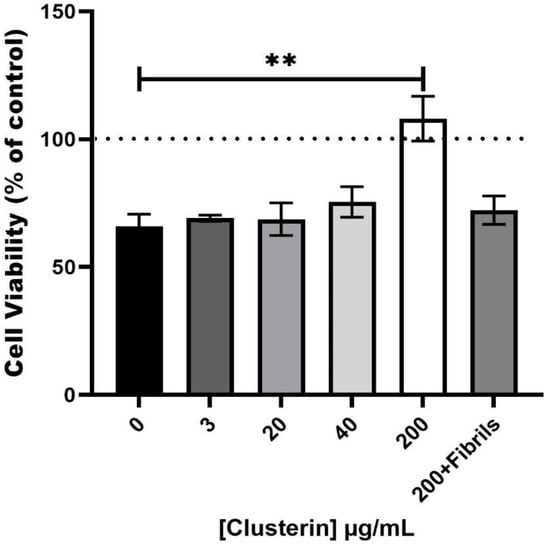 Several studies have shown that clusterin either enhances [,] or suppresses [] the cytotoxicity of Aβ but each of the studies used different conditions. Since human semen contains relatively high concentrations of both clusterin and PAP248–286, we investigated the effect of clusterin on the cytotoxicity of SEVI fibrils. Samples from the ThT assay, after 48 h of incubation, were added to PC-12 cells and the toxicity of samples with clusterin was compared to that of SEVI without clusterin present. SEVI (2 mg/mL) caused a reduction in cell viability of 34 ± 4% while PAP248–286 samples incubated with 3 and 20 µg/mL of clusterin had no significant alteration in cell viability compared to SEVI (30 ± 2% and 31 ± 6% reduction, respectively, Figure 3). 40 µg/mL of clusterin provided some protection with cell viability reduction of 25 ± 6%, whereas total suppression of SEVI toxicity was observed at 200 µg/mL of clusterin (108 ± 9% viability of control, p < 0.01, Figure 3). Clusterin (200 µg/mL) added to preformed SEVI fibrils (which are toxic to cells) had no significant impact on cytotoxicity (28 ± 6% reduction, Figure 3), despite being able to dissociate the long fibrillar species into smaller fibrillar species (as demonstrated in the TEM images in Figure 2f). However, the ThT-monitored dissociation, TEM appearance and degree of cell death were similar for experiments in which 40 µg/mL clusterin was added simultaneously and 200 µg/mL clusterin was added to preformed fibrils (25 ± 6% versus 28 ± 6% reduction, respectively; Figure 1 and Figure 3, and compare Figure 2d,f). Thus, it is not clear if the smaller SEVI fibrillar species produced in the presence of clusterin (Figure 2f) are cytotoxic or if smaller SEVI oligomers not visible by TEM are cytotoxic. However, these results are consistent with the findings of Narayan et al. [] who showed that amyloid β 1–40 (Aβ1–40) fibril disaggregation in the presence of clusterin results in binding of Aβ1–40 oligomers released from fibrils with clusterin to form stable clusterin-oligomer complexes that are toxic to cells. The addition of clusterin alone to the cell culture did not have significant effect on cell viability, consistent with previous studies []. Thus, clusterin has a significant protective effect on the cytotoxicity of SEVI towards PC-12 cells. The effect is concentration dependent, with higher concentrations of clusterin (at a sub-stoichiometric level) offering greater protection.