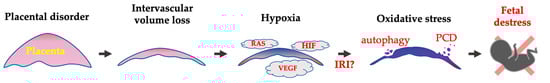 Events assumed to be occurring in the donor placenta. Abbreviations: HIF: hypoxia inducible factor; IRI, ischemia-reperfusion injury; PCD, programmed cell death; RAS, renin–angiotensin system; VEGF, vascular endothelial growth factor.