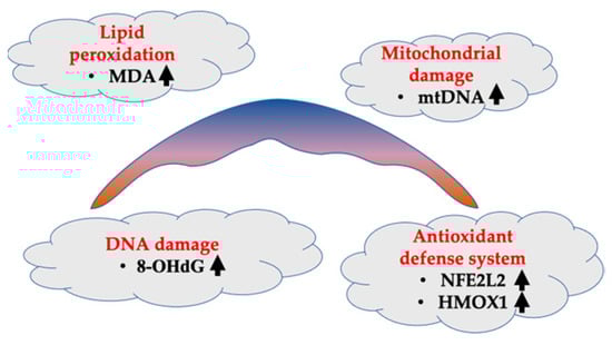 OS-induced changes in the placenta of a smaller twin in sFGR. Abbreviations: HMOX1, heme oxygenase 1; MDA, malondialdehyde; mtDNA, mitochondrial DNA; NFE2L2, nuclear factor erythroid 2 like 2; 8-OHdG, 8-hydroxydeoxyguanosine.