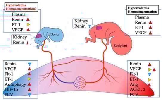 There is a significant amount of literature indicating that discordant renin–angiotensin system (RAS) activation in TTTS is pivotal in its pathophysiology, as the RAS plays an important role in the regulation of arterial blood pressure and sodium and water homeostasis []. Paradoxical RAS activation has been reported in some studies, as noted below. RAS upregulation was observed in the donor’s kidneys in TTTS, presumably secondary to hypovolemia, and downregulation was reported in the recipient’s renal system due to hypervolemia [,]. Although the results of renin regulation in the kidney reflect the pathophysiology in TTTS, there is some confusion caused by the findings of renin plasma levels in donor and recipient. There are reports that the plasma renin level tended to be higher in recipients compared with donors, but this difference was not significant, and the renin concentration in both donor and recipient was higher than in controls (unaffected MC twins) []. Indeed, it is controversial whether renin is transferred from the donor to the recipient via placental anastomoses. The amount of renin transferred would be insufficient to result in high recipient levels of donor origin because renin has a short half-life and chronic transfusion flow is too low (3% of fetal cardiac output per shared cotyledon) [,,], suggesting that the recipient is probably exposed to another source of RAS. The placentas of patients with TTTS showed higher expression levels of renin in the recipient than in the donor or controls on immunohistochemistry and Western blot []. These results indicate that the placenta may be the source of the high plasma renin levels in the recipient. In contrast, maternal plasma renin levels, which were slightly above the upper normal nonpregnant levels in TTTS, decreased after treatment with FLP [], indicating that sufficient amounts of renin are secreted from the placenta to increase or decrease fetal blood levels. A microarray analysis of the TTTS placenta demonstrated that angiotensin-converting enzyme (ACE)1, a potent vasopressor, and ACE2, a potent counter-regulator to ACE1, were upregulated in the recipient compared with the donor [,,,]. However, it is not known which action, ACE1-mediated vasoconstriction or ACE2-mediated vasodilation, is predominant in the recipient placenta. The uteroplacental unit possesses not only renin and ACE but also all components of the RAS necessary for the generation of Ang I and II []. For example, Ang II type 1 (AT-1) receptors are localized in the cytotrophoblast and syncytiotrophoblast of the placental villi []. In an analysis of the TTTS placenta, microarray data demonstrated greater expression of Ang, AT-1, and Ang II type 1 (AT-2) receptors in the recipient compared to the donor, indicating activation of RAS in the recipient sector []. Taken together, these studies show that it is difficult to explain the paradoxical changes of renin, including higher plasma renin concentration in the donor and recipient, downregulation in the recipient kidney and donor placenta, and upregulation in the donor kidney and recipient placenta, only by the presence of fetal blood volume discordance caused by anastomotic vessels. This indicates that another pathway or pathways must be involved.