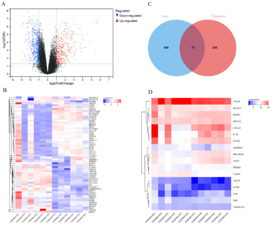 Identification of differentially expressed genes in gout. (A) Volcano map of differentially expressed genes associated with gout; (B) Heatmap demonstrating the top 30 upregulated and downregulated genes; (C) Venn diagram demonstrating the intersection between gout and pyroptosis-related differentially expressed genes; (D) Heatmap of 17 pyroptosis-related differentially expressed genes associated with gout.