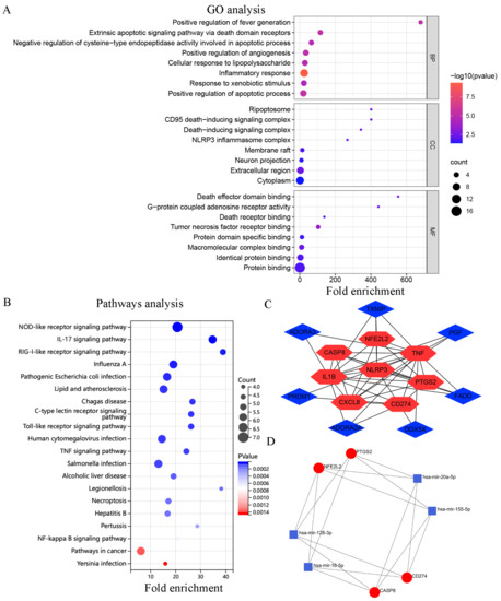 Enrichment analysis, PPI network, and miRNA-mRNA network of DEGs. (A) Top 8 GO terms; (B) Top 20 KEGG pathways; (C) PPI networks and hub genes; (D) MiRNA-mRNA network.