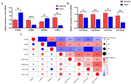 Verification of key differentially expressed genes related to gout and pyroptosis: (A) Expression of mRNAs; (B) Expression of miRNAs; (C) Pearson correlation analysis of mRNAs and miRNAs. (* p < 0.05; ** p < 0.01; *** p < 0.001; **** p < 0.0001).
