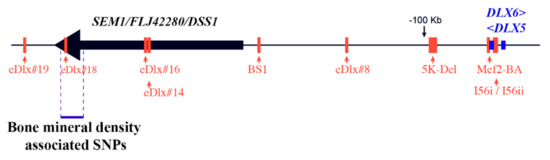 Remarkably, at least five GWAS studies have found a strong association between adult bone mineral density and SNPs located in the 7q21.3 region, including eDlx#18 [117,118,119,120,121]. Furthermore, a haplotype controlling bone mineral density and osteoporosis susceptibility has been reported in this locus [122]. This haplotype is constituted by a succession of co-segregating SNPs located in intronic regions close to the gene SEM1/FLJ4220/DSS1, which is associated to SHFM1 but has no known function. This locus includes upstream enhancers of DLX5/6. Collectively, these observations prompt us to conclude that polymorphisms in SNPs regulating DLX5/6 expression are involved in BMD determination and might be considered susceptibility factors for osteoporosis (Figure 2).