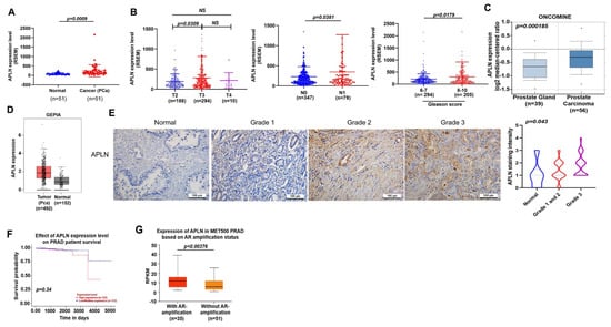 Apelin levels are associated with clinicopathological characteristics in prostate cancer metastasis. (A,B) Apelin mRNA levels in prostate cancer tissues were examined by the TCGA for tumor volume, lymph node metastasis and Gleason scores. Dots of bar graph means the number of patient. (C) Apelin levels in the prostate gland and cancerous prostate tissue from the Oncomine database. (D) Apelin expression in prostate cancer tissue samples and normal healthy tissue from the GEPIA database. (E) Representative images of IHC staining for apelin in tissue samples from healthy individuals and prostate cancer patients. (F) Increasingly lower survival time was associated with increasing levels of apelin expression. (G) Metastatic prostate cancer exhibited higher levels of apelin expression compared to primary prostate cancer (exposed by AR amplification). Scale bar for all images is 100 μm. NS, no significant difference.