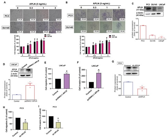 To examine the effects of apelin in prostate cancer cell motility, the PC3 and DU145 cell lines were stimulated with apelin. The results showed that apelin concentration dependently enhances cell migration and invasion (Figure 2A,B) but did not influence viability of PC3 and DU145 cells (Figure S1). A previous report has indicated higher migratory ability of PC3 cells compared to DU145 and LNCaP cells []. Our data indicated higher levels of apelin expression in PC3 cells than in DU145 and LNCaP cells (Figure 2C), implying that apelin is associated with migratory capacity in prostate cancer lines. Overexpression in LNCaP cells (lowest expressed apelin) or knockdown of apelin in PC3 cells (highest expressed apelin) promoted and reduced prostate cancer cell motility, respectively (Figure 2D–I), suggesting that apelin facilitates prostate cancer migration and invasion.