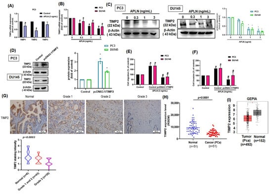 TIMPs inhibit MMPs synthesis and suppress tumor metastasis in different cancer types []. Stimulation of PC3 cells with apelin significantly inhibited TIMP2 synthesis by a greater extent than TIMP1 and TIMP3 synthesis (Figure 3A). Apelin also concentration-dependently decreased mRNA and protein synthesis of TIMP2 (Figure 3B,C). Furthermore, knockdown apelin increases the TIMP2 expression (Figure S2). Overexpression of TIMP2 antagonized apelin-induced promotion of cell motility (Figure 3D–F). The analysis of TCGA and GEPIA records as well as IHC data from the tissue array also revealed lower levels of TIMP2 in prostate cancer tissue than in normal healthy specimens (Figure 3G–I). Thus, apelin facilitates prostate cancer disease by inhibiting TIMP2 expression.