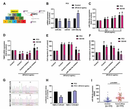 Apelin decreases TIMP2 expression and promotes prostate cancer cell motility by increasing miR-106a-5p expression. (A) MiRNA interference with TIMP2 transcription was predicted by combining 12 datasets from both miRwalk and ONCO.IO. (B,C) Cells were treated with apelin, then miRNA expression was examined by qPCR (n = 4). (D–F) Cells were applied with the miR-106a-5p inhibitor followed by stimulation with apelin, then cell migration (n = 4), invasion (n = 4) and levels of TIMP2 expression (n = 3) were performed. (G) Schematic 3′-UTR representation of the TIMP2 sequence. Red line indicated the point mutation site of miR-105a binding to TIMP2 sequence. (H) PC3 cells were applied with indicated plasmid, then treated with apelin and luciferase activity (n = 3) was measured. (I) Tissue samples from the TCGA database were measured for levels of miR-106a-5p expression in normal and prostate cancer tissues. Dots of bar graph means the number of patient. * p < 0.05 compared with the control group; # p < 0.05 compared with the apelin-treated group.