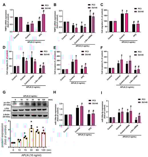 3.4. Apelin Inhibits TIMP2 Expression and Subsequently increases Prostate Cancer Cell Motility by Promoting miR-106a-5p Synthesis via the c-Src/PI3K/Akt Signaling