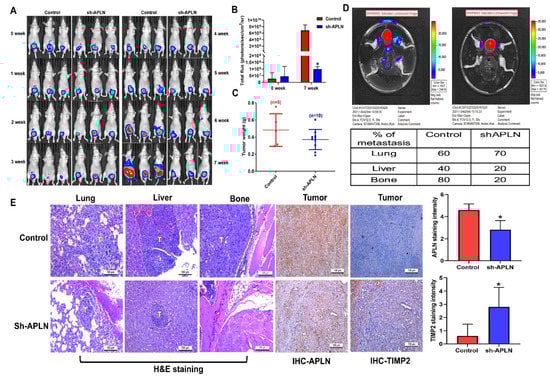 Apelin blockade inhibits prostate cancer metastasis in vivo. (A–E) PC3-Luc (n = 6) or PC3/sh-APLN-Luc cells (n = 6) were injected into the ventral prostates of SCID mice. Tumor growth, tumor metastasis to lungs, livers and legs were investigated by IVIS System. (E) Tissue specimens were stained with apelin or TIMP2 antibody and applied to IHC analysis. * p < 0.05 compared with the control group; Scale bar for all images is 100 μm.