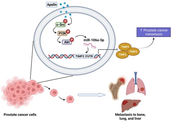 Apelin belongs to the adipokine family []. Apelin is important for normal physiological processes such as metabolism [], angiogenesis [], proliferation, and motility []. Apelin is also closely associated with the progression of many cancers [,]. Overexpression of apelin enhances the motility and migration of lung cancers [], hepatocellular cancers [] and colon cancers []. Although, the effect of apelin upon prostate cancers metastasis is unknown. Our investigation found higher levels of apelin expression in human prostate cancer tissue than in normal healthy samples. Apelin also appeared to promote the migration and invasion of prostate cancer cells by inhibiting TIMP2 production. Increasing miR-106a-5p synthesis via the c-Src/PI3K/Akt pathway regulated the effects of apelin, indicating that apelin may be worth targeting in metastatic prostate cancer.