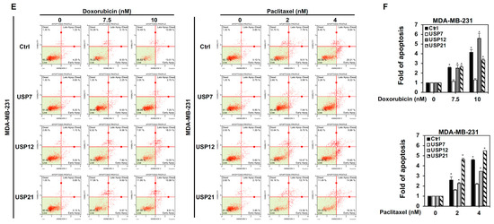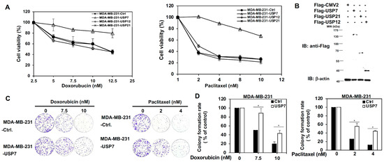 Role of ubiquitin specific protease (USP) 7 on the acquired chemoresistance of triple-negative breast cancer (TNBC). (A) Analysis of the viability of MDA-MB-231 cells with transient expression of USP7, USP12, and USP21, respectively, under serial doses of doxorubicin (left panel) or paclitaxel (right panel) treatment, as assed using MTT assays. (B) Protein levels of USP7, USP12, and USP21 in MDA-MB-231 cells with transient expression of USP7, USP12, and USP21, respectively, as assessed using western blot analysis. (C) Analysis of growth ability of MDA-MB-231 cells with transient expression of USP7 treated with doxorubicin (left panel) or paclitaxel (right panel) using colony formation assays. (D) Quantitative analysis of colony formation assays for doxorubicin (left panel) or paclitaxel (right panel)-treated MDA-MB-231-USP7 cells. (E) Analysis of apoptosis in MDA-MB-231 with transient expression of USP7, USP12, and USP21, respectively, treated with doxorubicin (left panel) or paclitaxel (right panel) according to Annexin V-dependent flow cytometry assays. (F) Quantitative analysis of the apoptotic levels of two different doses of doxorubicin (upper panel)- or paclitaxel (lower panel)-treated MDA-MB-231 cells with transient expression of USP7, USP12, or USP21, respectively. Data are represented as the mean ± SEM for biological triplicate experiments. * p < 0.05, compared with the results for control cells.