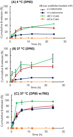 2.5. Stability Study: Releasing Test of B from B Cluster-Loaded AB-Lac Particles