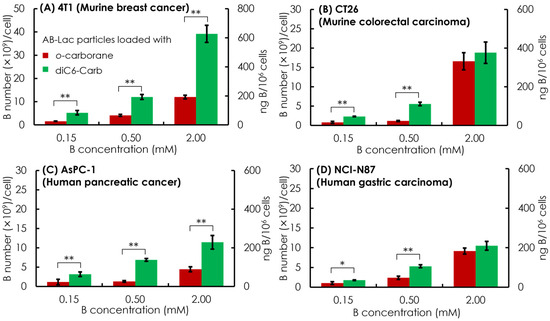 2.7. In Vitro Cell Uptake of B Cluster-Loaded AB-Lac Particles: Time- and Dose-Dependent Studies