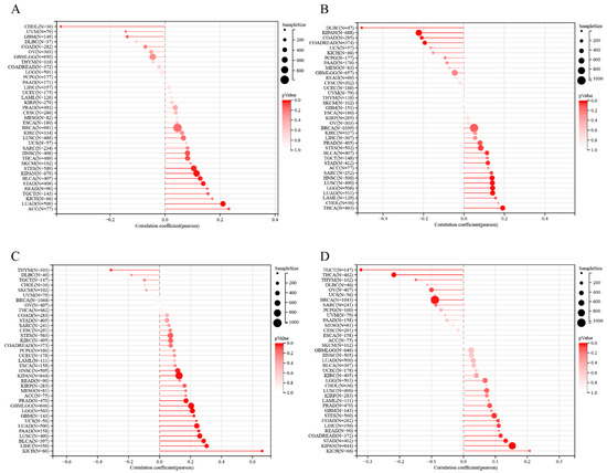 Figure 4A illustrates that MITD1 expression was positively correlated with TMB in LUAD, STES, KIPAN, STAD, BLCA, and ACC and inversely correlated with TMB in CHOL. ACC had the highest correlation coefficient. These results indicated that MITD1 expression was negatively correlated with low mutation status in CHOL but with a high mutational burden in the other six cancer types. As shown in Figure 4B, MITD1 expression was positively correlated with MSI in LGG, LUAD, STES, SARC, STAD, HNSCC, LUSC, THCA, and BLCA. Conversely, MITD1 was negatively correlated with COAD, READ, KIPAN, and DLBCL. THCA had the highest correlation coefficient with MITD1, and DLBCL correlated the least with MITD1. In LUAD, STES, STAD, and BLCA, MITD1 expression was positively correlated with both TMB and MSI, demonstrating that the higher the expression of MITD1, the higher the mutational burden.