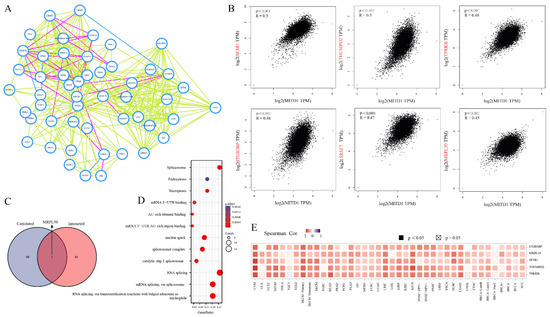 To further explore the molecular role of MITD1, we filtered 41 MITD1-binding proteins and MITD1-related genes for the enrichment analysis. Based on a few earlier studies on MITD1, these 41 proteins reportedly bind to MITD1, as evidenced either experimentally or through text mining. The connected network of these 41 proteins was illustrated using STRING (Figure 5A). The top 100 genes most related to MITD1 expression were obtained using the GEPIA2 tool. As shown in Figure 5B, MITD1 expression was positively correlated with splicing factor 3b subunit 1 (SF3B1), THUMP domain containing 2 (THUMPD2), TP53RK binding protein (TPRKB), integrin subunit beta 3 binding protein (ITGB3BP), serine/arginine-rich splicing factor 7 (SRSF7), and mitochondrial ribosomal protein L30 (MRPL30) levels. Using an interactive Venn diagram of the two groups, we identified only MRPL30 (Figure 5C). Figure 5E shows that in most cancer types, these six genes were positively related to MITD1. We performed KEGG and GO enrichment analyses by combining the results from the two datasets. Figure 5D suggests that MITD1 may be involved in RNA metabolism and endocytosis in cancer development.