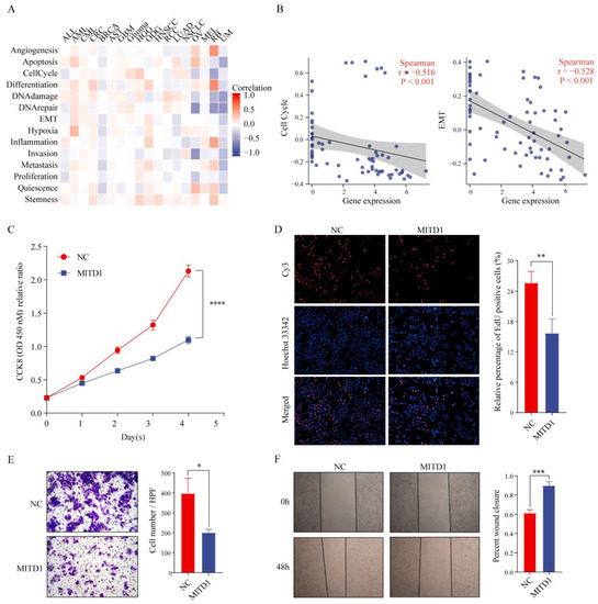 Functional analysis of MITD1. (A) Functional relevance of MITD1 at single-cell level through CancerSEA database. (B) The function analysis between MITD1 and cell cycle and epithelial–mesenchymal transition (EMT) at single-cell level. (C) CCK-8 analysis. (D) Representative images of EdU incorporation assay (magnification: ×100). (E) Representative images of Transwell analysis (magnification: ×100). (F) Representative images of wound healing analysis (magnification: ×40). * p < 0.05; ** p < 0.01; *** p < 0.001; **** p < 0.0001.