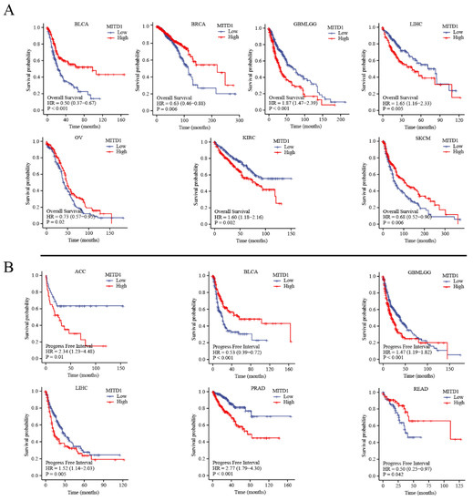 As shown in Figure 7B, high MITD1 expression was related to poor progression-free survival (PFS) in patients with ACC, GBMLGG, LIHC, and PRAD. Low MITD1 expression was related to poor PFS in BLCA and READ.