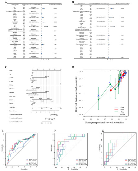 To analyze the value of MITD1 in BRCA, we performed Cox regression (Table S5) and analyzed the prognostic factors, including age, race, TNM stage, histological type, PR, ER, HER2 status, and MITD1 expression level, based on the data from TCGA. Following multivariate analysis, age, TNM stage, and ER status were negatively correlated with OS, whereas MITD1 expression was positively correlated with OS (Figure 8A,B). According to the multivariate Cox regression analysis and clinical practice, we used MITD1 and other risk factors to create a nomogram.