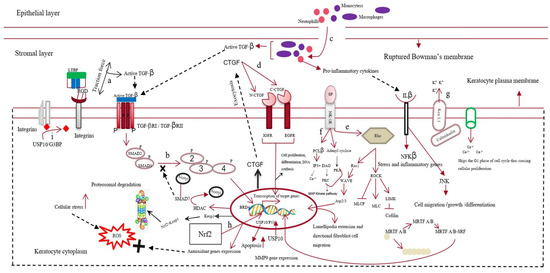 Mechanism of corneal scarring. This figure represents the keratocytes of the stromal layer, the epithelial layer, the disrupted Bowman’s membrane, and the stromal layer of the human cornea. The mechanism of corneal scarring is depicted in a single keratocyte cell for simplicity; (a) activation of transforming growth factor-β (TGF-β) from its latent state; (b) SMAD-dependent TGF-β signaling pathway; (c) infiltration of neutrophils and macrophages into the stromal layer and their secretion of active TGF-β; (d) CTGF (connective tissue growth factor) signaling pathway; (e) substance-P-mediated activation of the Rho/ROCK signaling cascade, leading to actin polymerization and MMP gene expression; (f) increase in intracellular Ca level by Substance-P-mediated PCL-β activation; (g) Kca3.1 ion-channel-mediated hyperpolarization of the keratocyte plasma membrane and subsequent influx of Ca ions; (h) Nrf2 (nuclear factor erythroid 2–related factor 2)-mediated antioxidant gene production; however, BRD4 (bromodomain-containing protein 4) increases keap1 expression, leading to the formation of the kelch-like ECH-associated protein 1 (keap1)/Nrf2 complex and their subsequent degradation; (i) deubiquitylation of integrins by the USP10/G3BP complex.