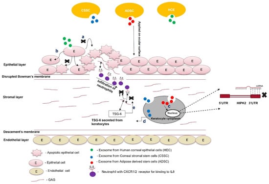 Role of exosomes in the treatment of scars. Exosomes from different cell types (ADSCs, CSSCs, and HECs) are loaded within the fibrin gel or encapsulated in the hydrogel and applied on the ocular surface; (a) exosomes from HECs taken up by the epithelial cells prevent paraptosis (apoptosis caused by hypoxic conditions); (b) epithelial cells treated with exosomes do not undergo apoptosis; (c) exosomes from ADSCs contain miR-19a, which post-transcriptionally silences HIPK2 and attenuates the JNK pathway; (d) exosomes from CSSCs contain TSG-6 protein, and once they are taken up by keratocytes, the TSG-6 proteins are secreted within them; (e) TSG-6 protein binds to GAG via its LINK domain and prevents the binding of IL8 to the GAG of corneal stroma; (f) the unbound form of IL-8 cannot be presented to the CXC1/2 receptor of neutrophils. It attenuates the infiltration of neutrophils to the wounded area of the cornea.