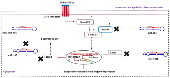 Ratuszny et al. [93] showed the significant upregulation of miR-145- and TGF-β-induced myofibroblasts in scarred human corneas compared to normal corneal and untreated corneal fibroblasts. The TGF-β-mediated upregulation of miR-145 in the myofibroblast induces α-SMA expression by downregulating KLF4. miR-145 mediates the post-transcriptional silencing of KLF4 by targeting its 3’UTR [94]. miR-145 silencing using anti-miR-145 resulted in decreased α-SMA and increased KLF4 expression. The lipofectamine-mediated transfection of a miR-145 inhibitor caused the stimulated cells to reduce collagen gel contraction in TGF-β-pretreated corneal fibroblast cells. This miR-145 inhibitor decreased the migratory capacity of myofibroblasts by 50%. Sun et al. [95] reported that miR-145 can directly target the 3′UTR of KLF4, mediating post-transcriptional gene silencing. KLF4 is an EMT suppressor that interacts directly with the promoter of SMAD7 and upregulates its expression. The increased expression of SMAD7 prevents SMAD2/3 phosphorylation and localization, disrupting the TGF-β signaling pathway [96]. Therefore, miR-145 is a promising target for further therapeutic exploration to prevent corneal scar formation.