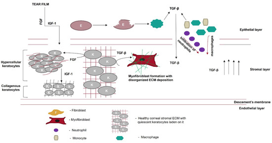 Corneal wound healing is accompanied by the secretion of various growth factors. During wound healing, these growth factors interact with their cognate receptors present on the surface of the cell to regulate the synthesis of collagen, proteoglycan, and other ECM components’ deposition. Various growth factors, such as IGF-1, platelet-derived growth factor (PDGF), TGF-β, and fibroblast growth factor 1 (FGF-1), either reach the wound site from the tear film or are secreted by the surrounding wounded or apoptotic epithelial cells. Etheredge et al. [110] reported that FGF-1 stimulates keratocyte proliferation; however, it inhibits the synthesis of type 1 procollagen and keratan sulfate. Type 1 procollagen is an essential component of the stromal ECM, and keratan sulfate directs collagen assembly to maintain corneal transparency. FGF-1 induces the formation of hypercellular keratocytes with densely packed cells in the sparse matrix. IGF-1 turns these hypercellular keratocytes into collagenous keratocytes that secrete ECM components, similar to native keratocytes. Therefore, the IGF-1/IGF-receptor signaling pathway prevents the transformation of keratocytes into myofibroblasts and ECM remodeling (Figure 5). However, this is not a predominant signaling pathway during wound healing because the local concentration of TGF-β in the wound microenvironment is high. Therefore, the TGF-β/TGF-βRI pathway takes charge, and TGF-β binds to its receptor on keratocytes to synthesize biglycan, fibronectin containing extra domain A, and hyaluronan. This proteoglycan disrupts the spacing between collagen fibrils, reducing the corneal transparency. It also guides the differentiation of keratocytes into myofibroblasts, characterized by the neo-expression of α-SMA. α-SMA incorporates actin into collagen fibrils and exerts a contractile force on the ECM, disrupting the normal corneal architecture.