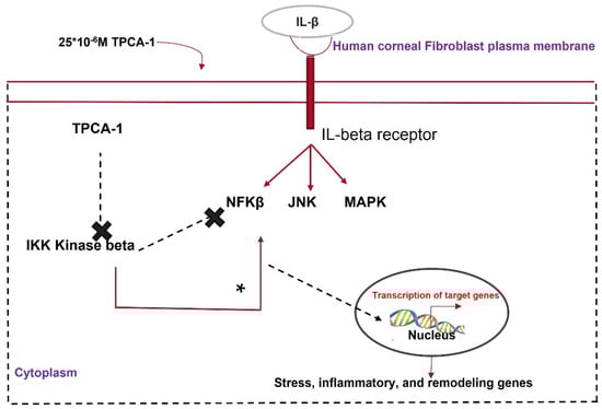 IL-β, a proinflammatory cytokine, crosses the disrupted Bowman’s membrane and binds to receptors on keratocytes upon injury, promoting apoptosis or angiogenesis in the cornea [137]. IL-1β activates the NF-κβ pathway, which causes inflammation and fibrosis. The NF-κβ pathway is activated by the phosphorylation of either the IKKα or IKKβ subunit of its key modulator, IKK. TPCA1 inhibits the phosphorylation of the IKKβ subunit and deactivates the NF-κβ pathway. Zhang et al. [138] showed that TPCA1 preserved the keratocyte phenotype in HCFs pretreated with IL-β via nuclear accumulation of phosphorylated NF-κβ. Corneal keratocytes stimulated with IL-1β showed the reduced expression of keratocyte markers such as KERA, LUM, and ALDH3A1 and elevated levels of phosphorylated NF-κβ [139]. IL-1β treatment elevated MMP2, MMP3, and MMP9 expression in corneal fibroblasts. This was reversed by TPCA-1 application to IL-1β-stimulated fibroblasts [140]. MMPs have multiple roles in wound healing, such as ECM remodeling, TGF-β cleavage, and the activation of EMT [141]. TPCA-1 can prevent corneal scarring by inhibiting IKK and MMP (Figure 6).