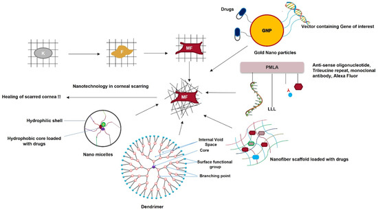 Nanotechnology as a therapeutic tool for reviving scarred corneas. Keratocytes transform into fibroblasts and then into myofibroblasts in the presence of TGF-β. This disrupts the highly organized fibrillar arrangement of the corneal stromal ECM. Nanoparticles loaded with the gene of interest or specific drugs, nanofiber scaffolds loaded with drugs, dendrimers, nanomicelles, and nanopolymers are a few nanomedical approaches for treating a scarred cornea.