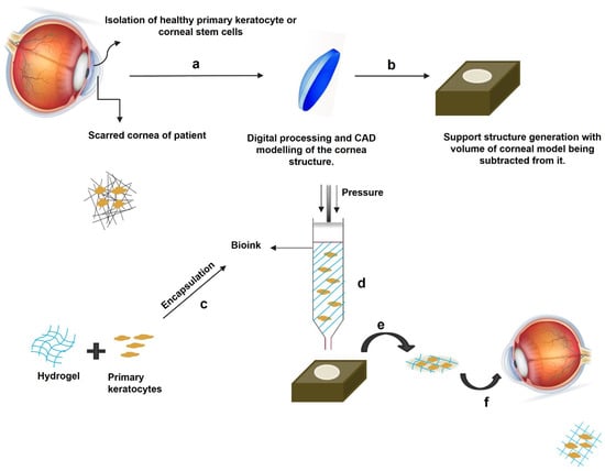 - Duarte Campos, D.F.; Rohde, M.; Ross, M.; Anvari, P.; Blaeser, A.; Vogt, M.; Panfil, C.; Yam, G.H.; Mehta, J.S.; Fischer, H.; et al. Corneal Bioprinting Utilizing Collagen-based Bioinks and Primary Human Keratocytes. J. Biomed. Mater. Res. Part A 2019, 107, 1945–1953. [Google Scholar] [CrossRef] [PubMed]