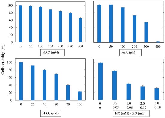 The results of final cytotoxicity assays using a narrow range of compound concentrations are shown in Figure 1. The assays were conducted to identify the subtoxic concentrations in order to avoid toxic effects in the cellular model used. Cell viability was determined after 24 h of treatment with a range of antioxidant/oxidant concentrations. The concentrations of test compounds that decreased viability by at least 30% were considered to be toxic. By following this criterion, AsA was toxic at concentrations above 200 µM, H2O2 above 50 µM, and HX/XO above 0.5 mM/0.03 mU. NAC was toxic only at the highest concentration tested (300 mM). However, we decided to use NAC at 25 mM because, at this concentration, the cells did neither show any cytopathic effect nor loss of adhesiveness.