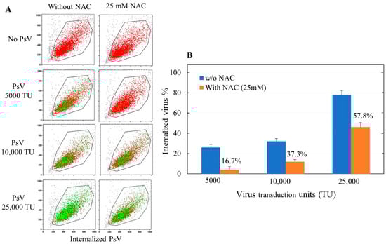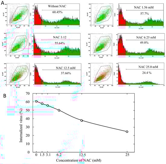 The comparison between NAC-free and NAC-treated cells is summarized in Figure 3B, showing the means of three replicates with SD < 10% of the means. The following conclusions can be drawn: (a) The proportion of internalized pseudovirus is related to the dose of virus challenged with cells, with 25.1% of cells infected by the virus at the dose of 0.5 × 104 TU, 31.0% at the dose of 1 × 104 TU, and 78.1% at the dose of 2.5 × 104 TU; (b) At all virus doses, a fixed concentration of NAC (25 mM) significantly and considerably inhibits the proportion of internalized virus; (c) Inhibition by NAC is inversely related to the dose of virus. In particular, the inhibition coefficients at the doses of 0.5, 1, and 2.5 × 104 TU of virus, calculated as [(internalized virus in the absence of NAC -internalized virus in the presence of NAC)/internalized virus in the absence of NAC × 100] are 81.4%, 62.7%, and 42.2%, respectively.