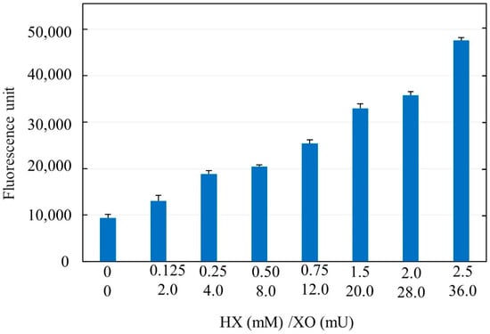 NAC was a gift by Zambon Group (Vincenza, Italy) as a pure compound in the form of a mesh powder. AsA, H2O2, HX, and XO were purchased from Sigma Aldrich (Merck Life Science, Milan, Italy). To measure the efficacy of the reaction between XO and HX to generate ROS, we have developed a simple method using a free radical probe, dichlorofluorescindiacetate (DCFH-DA). DCFH-DA is able to recognize radical species in a cellular system after it enters the intracellular environment. In the cytosol, cellular esterases hydrolyze DCFH-DA to DCFH, which is then oxidized by free radicals to the fluorescent DCF. We mixed XO and HX at different concentrations and added 1% of human serum to ensure the presence of esterases. Subsequently, fluorescence emission was measured by fluorometric analysis at 535 nm emission and 485 nm excitation wavelengths. The results were expressed as the increase in fluorescence compared to control samples missing HX and XO.