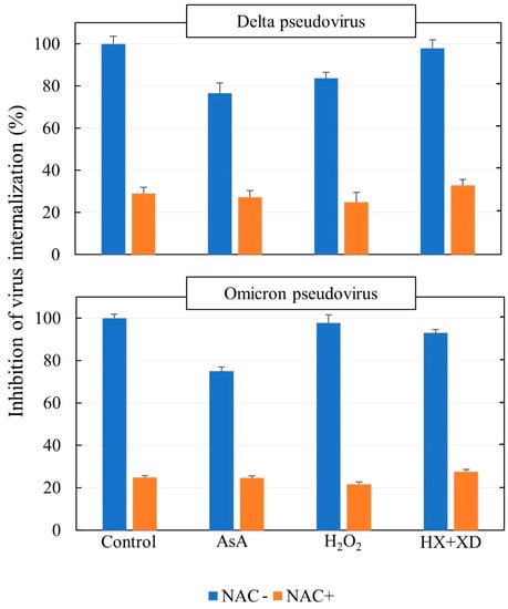 Internalization of Delta and Omicron SARS-CoV-2 pseudoviruses (10,000 TU/culture) into ACE2-HEK293 cells, as related to the treatment of cells with either ascorbic acid (AsA, 200 µM) or hydrogen peroxide (H2O2, 50 µM), or a mixture of hypoxanthine (HX, 31 µM) and xanthine oxidase (XO, 0.5 mU/mL), and either in the absence or in the presence of NAC (25 mM). The results are the means ± SD of triplicate analyses and are expressed as the percent of the values recorded in virus controls.