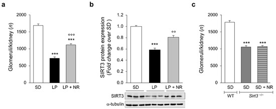 NR supplementation restores nephron number and SIRT3 expression in the kidneys of maternal LP diet offspring. (a) Glomerular number quantified in the kidney of newborn mice (day 1) born to mothers fed a SD during pregnancy or a LP diet supplemented or not with NR; n = 14 kidneys from 14 newborn mice for each group. (b) Representative Western blots and densitometric analysis of SIRT3 protein expression in total kidney extracts harvested from newborn mice (day 1) from mothers fed with SD (n = 8 samples), LP diet alone (n = 9 samples) or with NR (n = 9 samples). Each sample consisted of a pool of at least 4 kidneys from 4 newborn mice. (c) Quantification of the glomerular number in kidneys of the offspring of WT (n = 12 kidneys from 12 newborn mice) or Sirt3−/− mice fed a SD supplemented or not with NR during pregnancy (n = 11 and n = 14 kidneys from 11 and 14 newborn mice, respectively). Results are presented as mean ± SEM and were analyzed with ANOVA with Tukey’s post hoc test. *** p < 0.001 vs. SD; °° p < 0.01, and °°° p < 0.001 vs. LP.