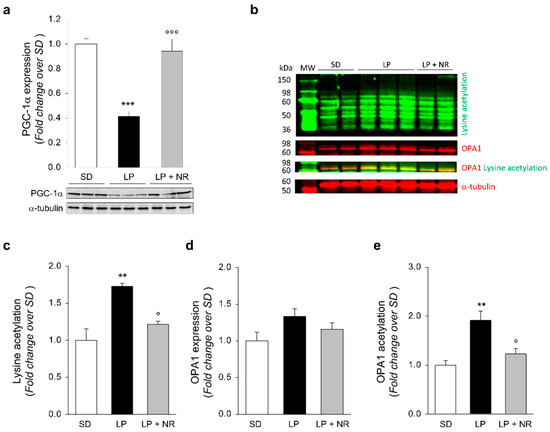 NR supplementation upregulates PGC-1α in maternal LP diet offspring and normalizes hyperacetylation of mitochondrial proteins. (a) Representative Western Blots and densitometric analysis of PGC-1α protein expression in total kidney extracts harvested from newborn mice (day 1) from mothers fed a SD, LP diet alone or with NR (n = 7 samples per group). Each sample consisted of a pool of at least 4 kidneys from 4 newborn mice. (b–e) Representative Western Blots (b) and densitometric analysis of lysine acetylation (c), OPA1 expression (d), and OPA1 acetylation (e) in total kidney extracts harvested from newborn mice (day 1) from mothers fed with SD, LP diet alone or with NR (n = 3 samples per group). Each sample consisted of a pool of at least 4 kidneys from 4 newborn mice. OPA1 acetylation has been evaluated as the colocalizing signal (yellow) between acetyl lysine (green) and OPA1 (red). In all gels, α-tubulin was used as a sample loading control. Results are presented as mean ± SEM and were analyzed with ANOVA with Tukey’s post hoc test. ** p < 0.01, and *** p < 0.001 vs. SD; ° p < 0.05, and °°° p < 0.001 vs. LP.