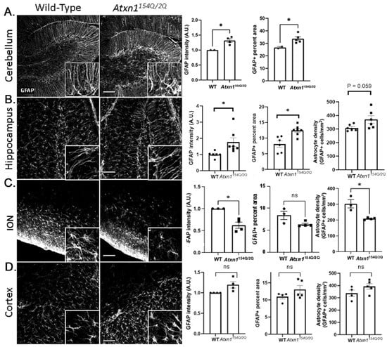 Spatial diversity of astrocytic morphology in Atxn1154Q/2Q mice early in disease. Brain sections from 12 weeks old Atxn1154Q/2Q and wild-type littermate controls were stained for GFAP. Confocal images of cerebellum ((A), lobule X), hippocampus ((B), dentate gyrus), brainstem ((C), ION (inferior olivary nucleus), and motor cortex ((D), layer 6 and corpus callosum) were used to quantify GFAP intensity, density of astrocytes, and GFAP area. Images were acquired at 20× (636.16 µm × 636.16 µm). Scale bars show 100 µm. Insets in the lower right corners of each image show zoomed images (79.5 µm × 79.5 µm) for qualitative assessment of astrocyte morphology. Data are presented as mean ± SEM with average values for each mouse represented by a dot. N = 3–7 mice of each genotype (WT and Atxn1154Q/2Q) as noted by dots representing individual mice in each bar graph. ns: not significant, * p < 0.05 Students t-test.