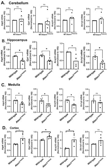 We next investigated molecular changes in SCA1 astrocytes across brain regions. Among the astrocytic roles critical for neuronal function is maintaining the homeostasis of the extracellular environment. Astrocytes accomplish this by removing excess extracellular glutamate via glutamate transporters encoded by the Slc1a3 and Slc1a2 genes, potassium ions via the potassium channel encoded by Kcnj10, and water through the expression of Aquaporin-4, encoded by Aqp4 [61,62,63,64]. Both Slc1a2 and Slc1a3 are present in astrocytes throughout the brain, but Slc1a3 is preferentially expressed in the cerebellum and Slc1a2 in the hippocampus. Astrocyte intercommunication in a network allowing for calcium wave propagation, and also potassium and glutamate buffering, is facilitated by Connexin43 encoded by Gja1. We compared the molecular changes in SCA1 astrocytes across the cerebellum, brainstem (medulla), hippocampus, and cortex by quantifying the expression of these critical astrocytic core genes using RT-qPCR.