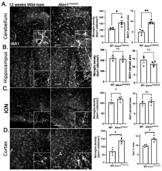 We have previously shown that microglia are reactive in SCA1 cerebellar cortex and contribute to SCA1 pathogenesis in different SCA1 mouse models [65,66]. We investigated changes in microglial density and morphology in the cerebellum and other brain regions using IHC staining for the microglial marker ionized calcium-binding adaptor protein (Iba1). We quantified microglial density and the percent area covered by microglial Iba1+ processes (Figure 3). In the cerebellum, we found a significant increase in microglia density and Iba1+ percent area in 12-week-old Atxn1154Q/2Q mice (Figure 3A). Similarly, in the ION (Figure 3C) and cortex (Figure 3D), we found an increase in microglial density. Microglial area, indicative of hypertrophy, was significantly increased only in the cortex. We found no significant changes in microglial density or percent area in the hippocampus (Figure 3B).
