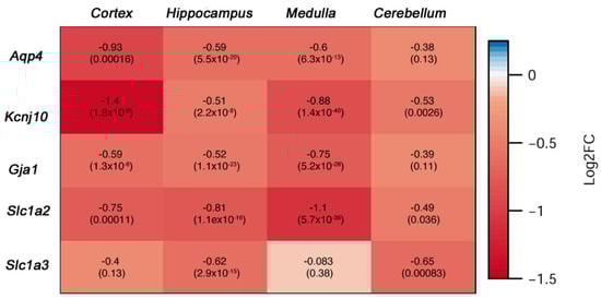 Late SCA1 stage astrocyte molecular analysis indicates brain-wide loss of core homeostatic functions. Cerebellum, brainstem (medulla), hippocampus, and cortex were isolated from 26 weeks old Atxn1154Q/2Q and wild-type control mice (N = 4 of each genotype) and isolated RNA was sent for RNA-sequencing (RNA-seq). Expression of astrocyte genes was determined using differential gene expression analysis with numbers in each square representing log2 fold change (log2FC) in Atxn1154Q/2Q compared to wild-type controls and numbers in brackets presenting False Discovery Rate adjusted p values.